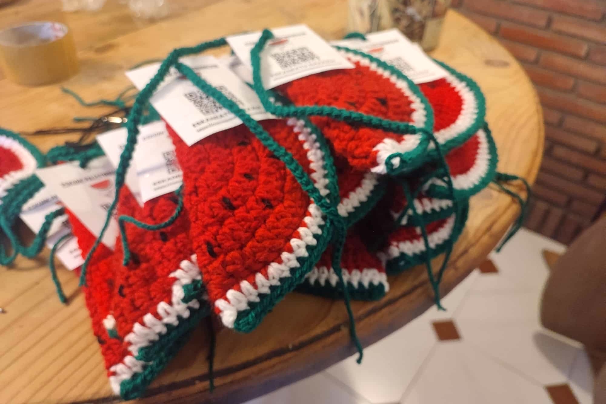 Eskuak Palestinarekin herritarren kolektibo bat da, eta ekimen independente gisa sortu zen Palestinako egoera ikusarazteko craftivismoaren bidez. Hau da, arte eta eskulanak salaketa- eta elkartasun-tresna gisa erabiltzen dituen aktibismo sortzailearen bidez. Sandien ekintza hasiera batean crochet-etik sortu zen, baina laster beste teknika batzuetara zabaldu zen, gaur egun ehunka pertsona munduko 100 hiri baino gehiagotan bilduz.