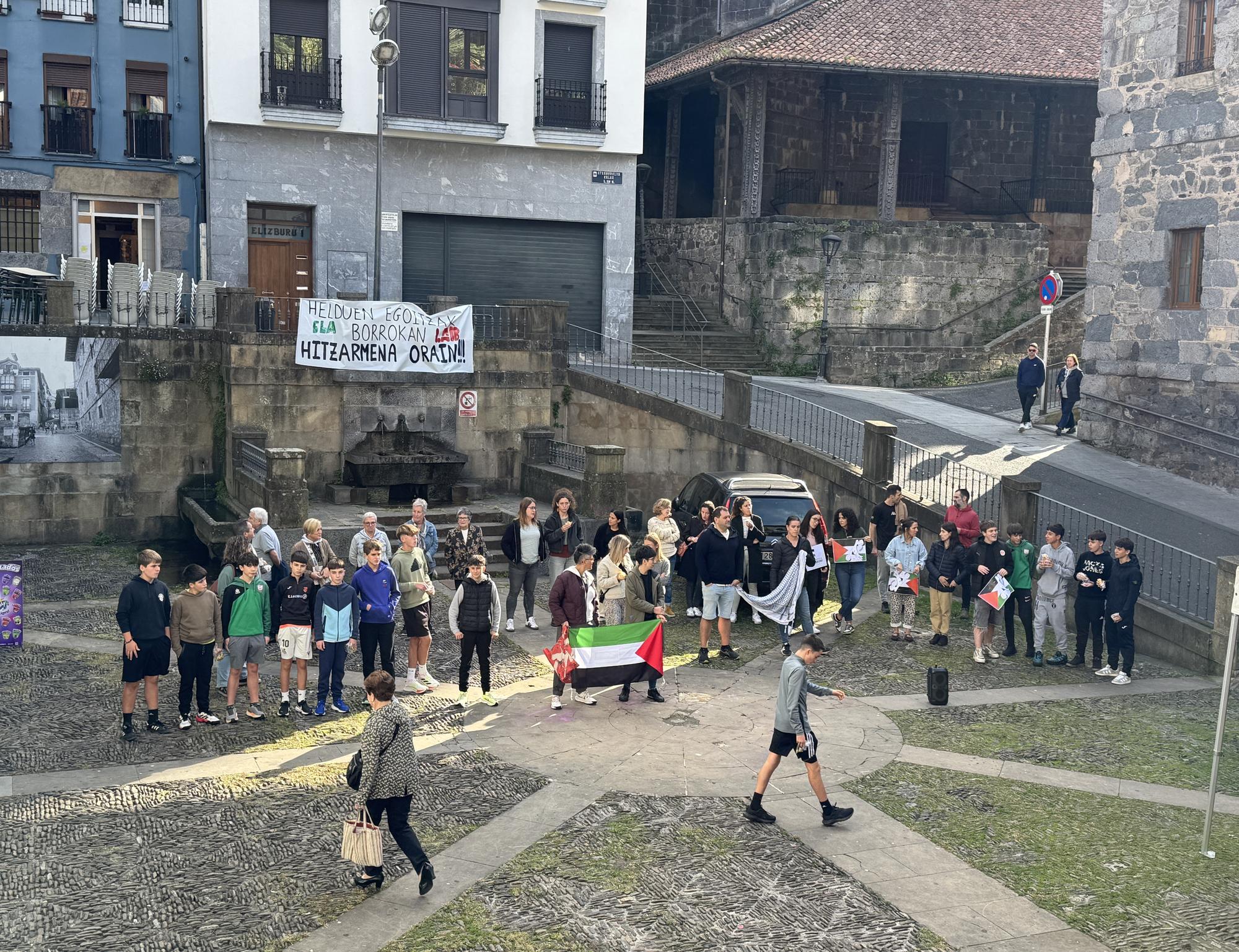 Bonbardaketa-sirena hotsek inguratuta egin dute gaur goizean Palestinako genozidioa salatzeko elkarretaratzea Plaza Barrixan. 40-50 lagun inguruk parte hartu du, ikasle-irakasleen kasuan, bakoitzaren ordutegiak lagatakoaren arabera egokituz presentzia.