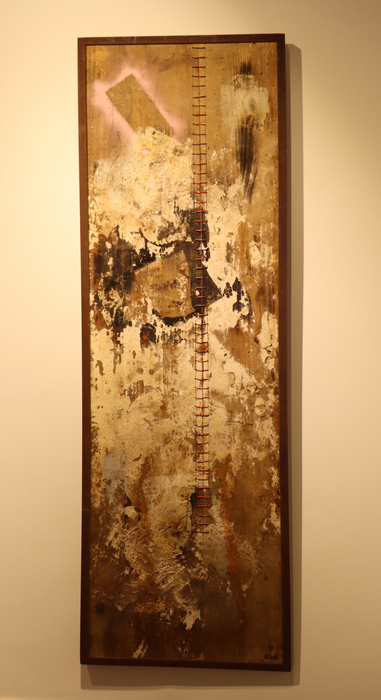 Obra nagusiak eskulturak izan arren, pinturak ere zintzilikatu ditu galeriako paretetan. Baina ez dira ohiko koadroak, apropos marraztutakoak, eskulturen sortze-prozesuaren "albo-kalte bat" baizik. Kontatu zuenez, eskulturak egiten duen bakoitzean egurrezko taula bat jartzen du azpian, zorua eta pieza bera babesteko. Prozesuan egindako soldatze, margotze, mozketa... eta bestelako lanek, marka desberdinak lagatzen dituzte taula horretan. Batzuetan, tenperatura altuengatik apurtzera ere ailegatzen da, eta berak "josi" egiten du alanbrearekin. Bukatzean, taula hartu eta marko bat jartzen dio, "akats guzti horiek, prozesuaren kontakizun zintzoa" direlako.